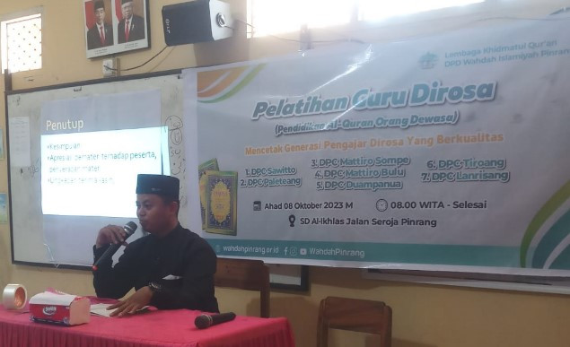 Acara Pelatihan Guru Dirosa Ke VI ini dibuka langsung oleh Ustaz Asri Jaya, S.Pd, Ketua DPD Wahdah Islamiyah Pinrang, yang melihat acara ini sebagai langkah penting dalam memperkuat pendidikan Al Qur'an di Kabupaten Pinrang. Semoga pelatihan ini memberikan manfaat besar bagi pendidikan agama di daerah Pinrang dan meningkatkan pemahaman agama di kalangan masyarakat.